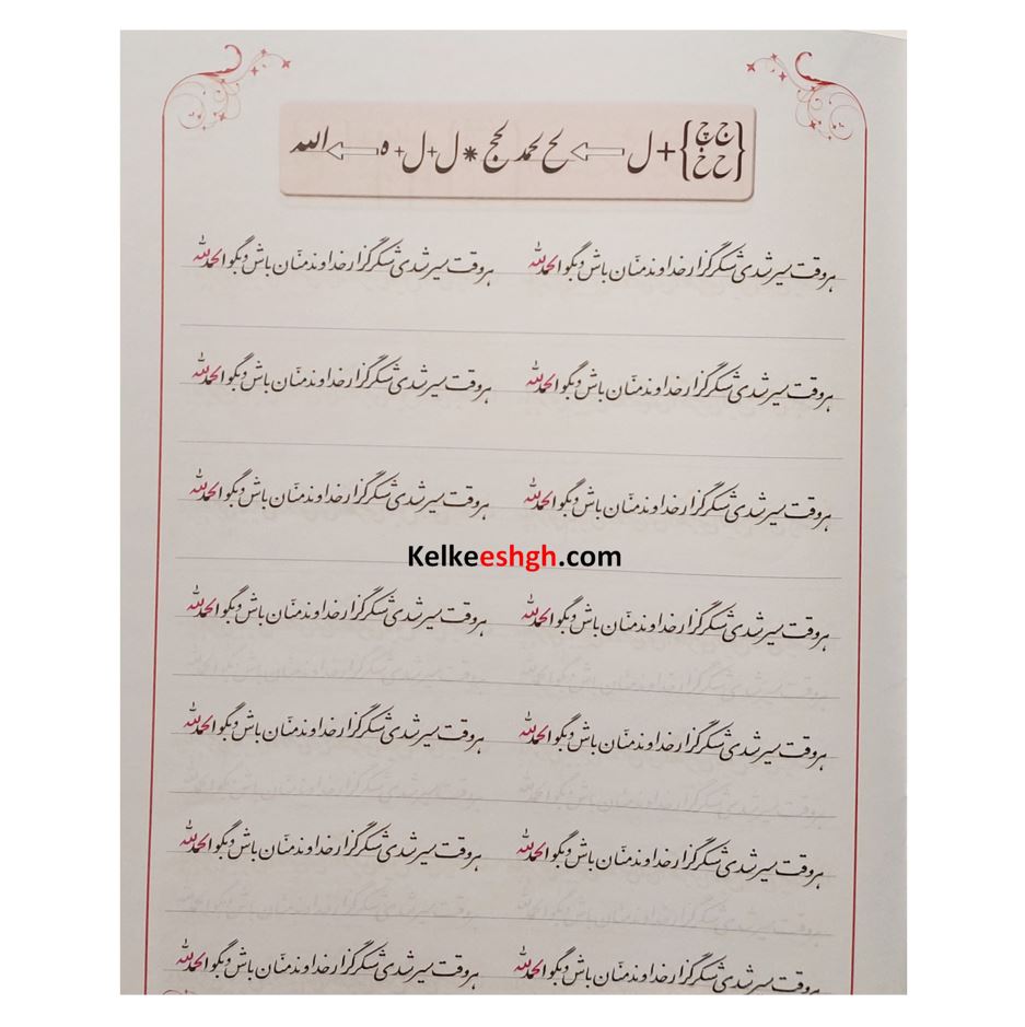 این مجموعه ارزشمند توسط استاد مهدی شیخ ربیعی با هدف آموزش خط تحریری تدوین شده است. کتاب حاضر علاوه بر تمرینات معمول که در کتابهای دیگر هم وجود دارد حرکت نوآورانه ای به انجام رسانده و مطالب و نکات فنی خوشنویسی را در قالبی بسیار ساده و مختصر در جدول بالای هر درس ارائه نموده است. مزیت دیگر کتاب ترتیب و توالی از ساده به سخت سطرها می باشد که هنرجو را آرام آرام وارد فضای حرفه ای خوشنویسی می نماید.