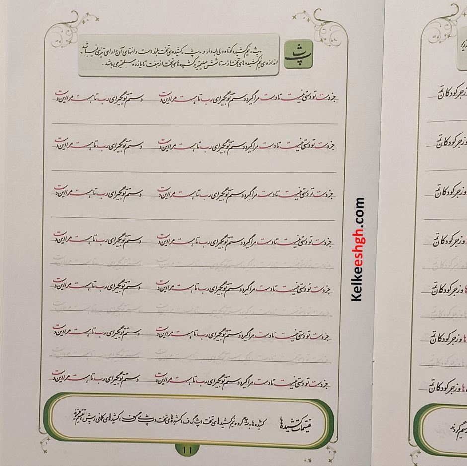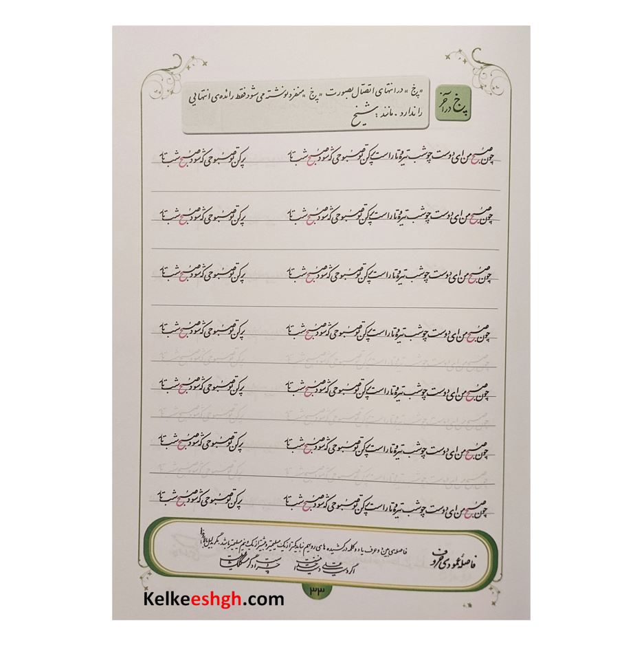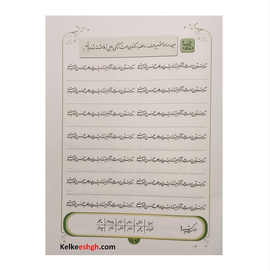 این مجموعه ارزشمند توسط استاد مهدی شیخ ربیعی با هدف آموزش خوشنویسی با خودکار تدوین شده است. کتاب حاضر علاوه بر تمرینات معمول که در کتابهای دیگر هم وجود دارد حرکت نوآورانه ای به انجام رسانده و مطالب و نکات فنی خوشنویسی را در قالبی بسیار ساده و مختصر در جدول پایین هر صفحه ارائه نموده است. مزیت دیگر کتاب ترتیب و توالی از ساده به سخت سطرها می باشد که هنرجو را آرام آرام وارد فضای حرفه ای خوشنویسی می نماید.